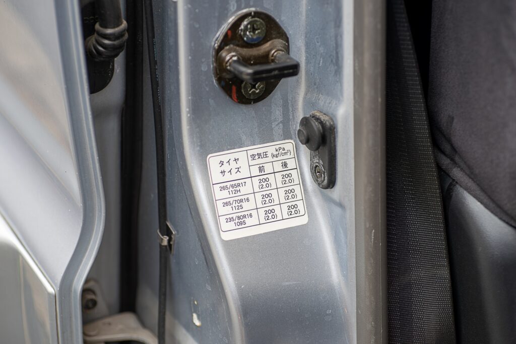 適正空気圧(指定空気圧)は、運転席のドア開口部付近や給油口の裏側などに貼られたシールで確認できます。このシールには、一般的に「kPa」(キロパスカル)という単位で記載されています。
