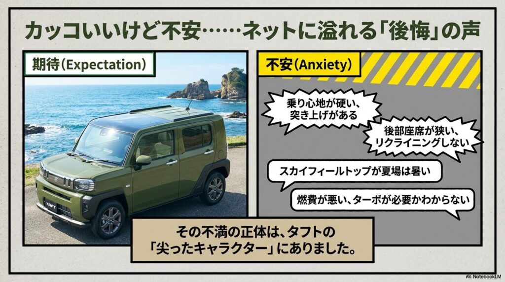 また、後部座席が狭いことやリクライニングしない点など、居住性に関する悩みも少なくありません。さらに、燃費が悪いのではないか、ターボが必要かといった維持費やパワーの面、スカイフィールトップが暑い、眩しいといった特有の装備に関する後悔の声も聞こえてきます。