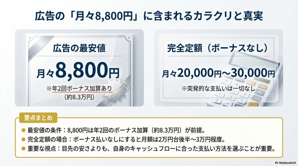 この最安値は、年2回のボーナス払い(約8.3万円前後)を併用した際の金額なんですね。ボーナス併用を前提にすることで、毎月の支払額をグッと抑えて見せているわけです。